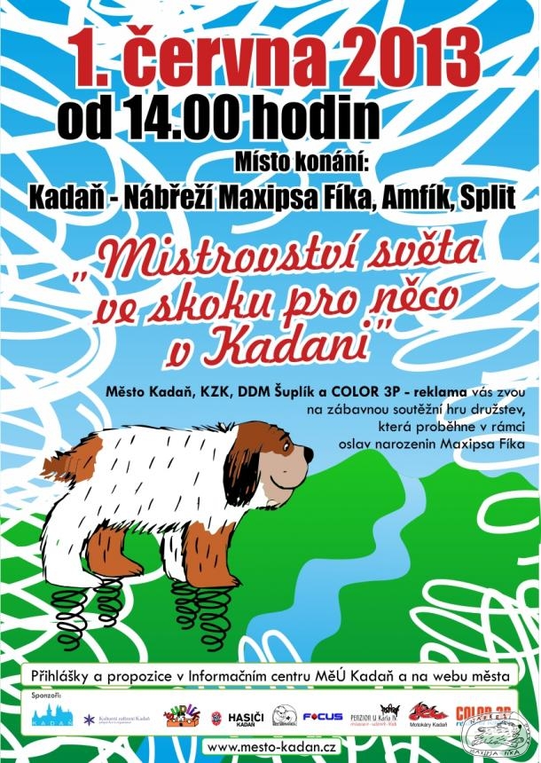 Město Kadaň, KZK, DDM Šuplík a COLOR 3P - reklama vás zvou na zábavnou soutěžní hru družstev, která proběhne v rámci oslav narozenin Maxipsa Fíka - Mistrovství světa ve skoku pro něco 2014.