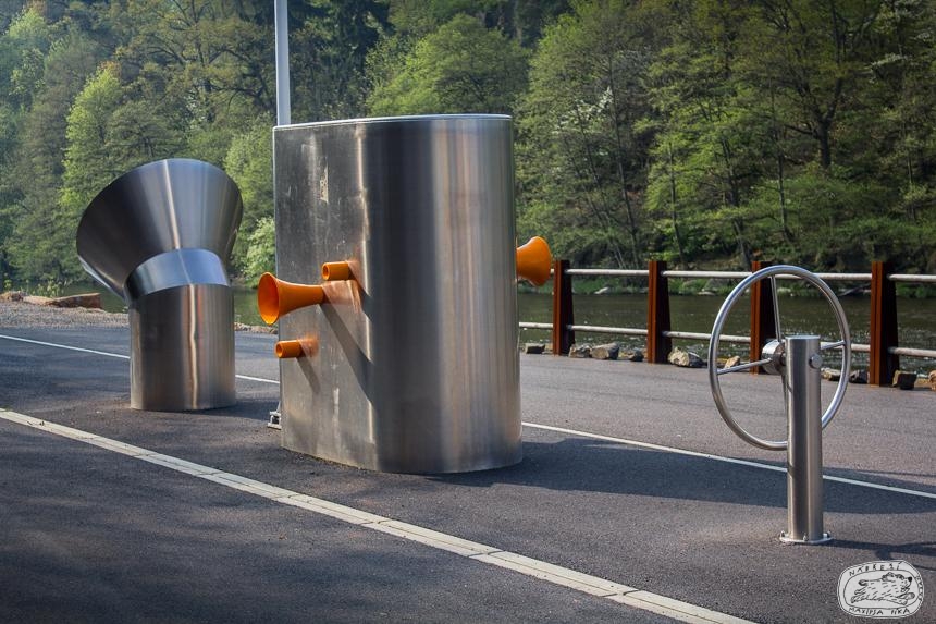 Vedle hrází přehrady a pod Lávkou Víta Brandy jsou umístěna umělecká díla akustický park - gong, bubínky, hlásné trouby, zvukovody a atrakce pro skateboard.